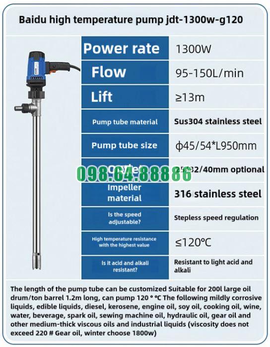 Công suất mạnh mẽ của dòng bơm thùng phuy nhiệt độ cao JDT-1300W-G120