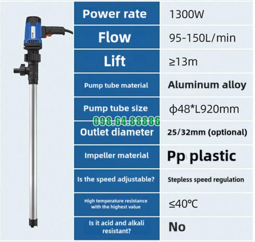 Máy bơm điện nhúng thùng phuy JDT-1300W-L92 hoạt động tốt ngay cả với hóa chất