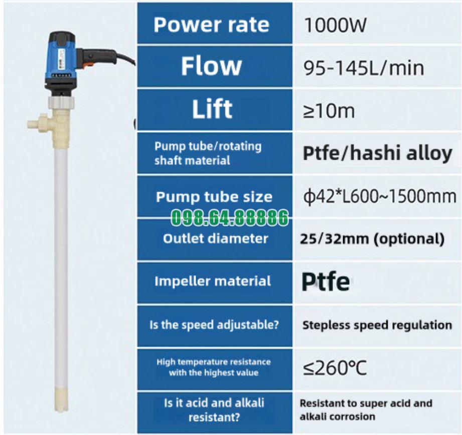 Khi bơm điện nhúng thùng phuy hóa chất chống ăn mòn model JDT-1000W-PTFE: