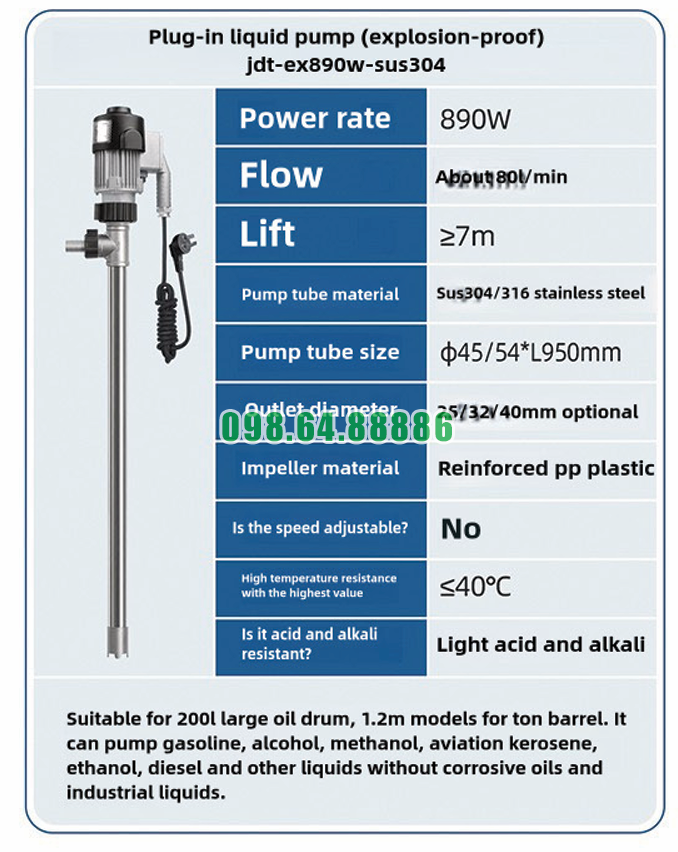 Thông số Máy bơm chất lỏng cắm trực tiếp chống cháy nổ JDT-EX890W-SUS304