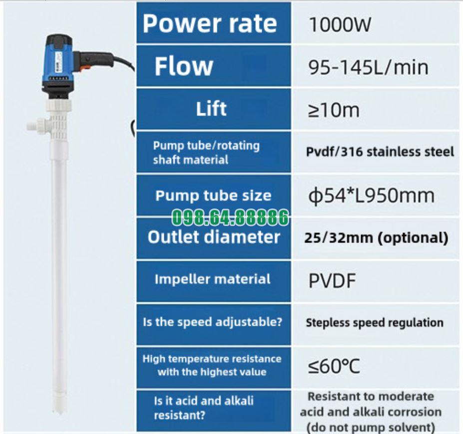 Bơm thùng phuy công suất lớn model JDT-1000W-PVDF