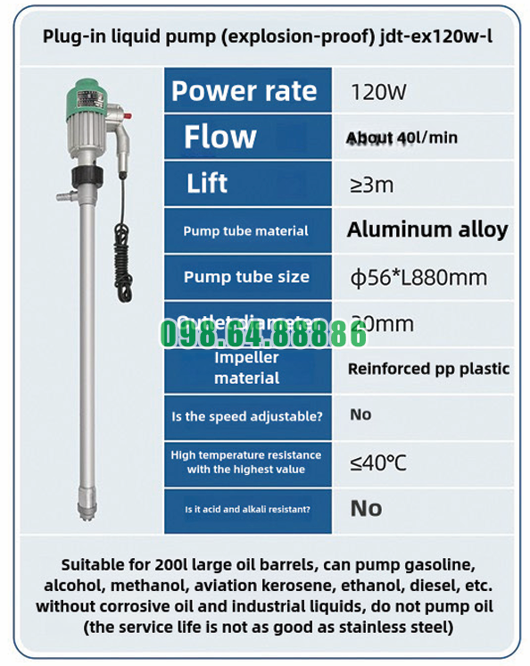 Máy bơm chất lỏng cầm tay chống cháy nổ JDT-EX120W-L phù hợp với các dung môi dễ cháy thường chứa trong phuy như xăng, ethanol, diesel.