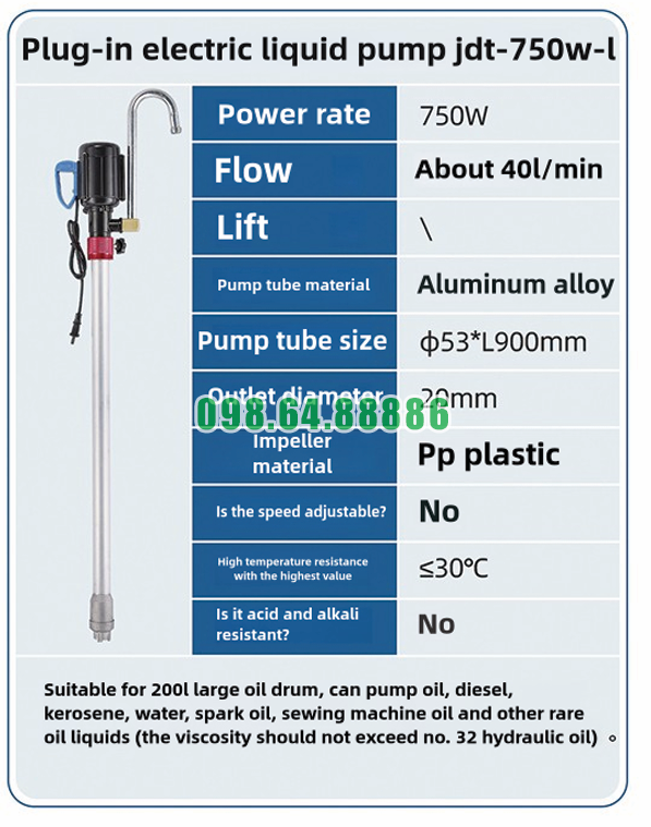 Máy bơm JDT-750W-L với động cơ công suất 750W giúp việc bơm các chất lỏng từ thùng phuy 200L vào các bồn chứa hoặc hệ thống phân phối diễn ra rất nhanh chóng và hiệu quả. Điều này giúp tiết kiệm thời gian trong các công việc yêu cầu chuyển tải chất lỏng nhiều lần trong ngày, như trong các trạm xăng dầu, xưởng sản xuất, hoặc các cơ sở bảo dưỡng xe cộ.