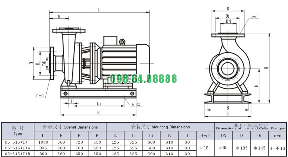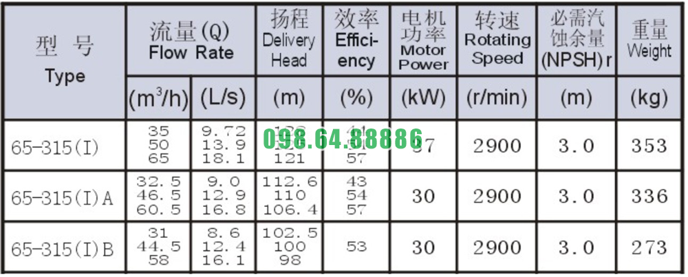 Bảng thông số kỹ thuật bơm nước trục ngang SLW65-ISW65-315-I