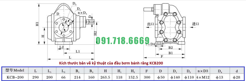 Bảng thông số kỹ thuật của bơm bánh răng đường kính 50mm KCB200