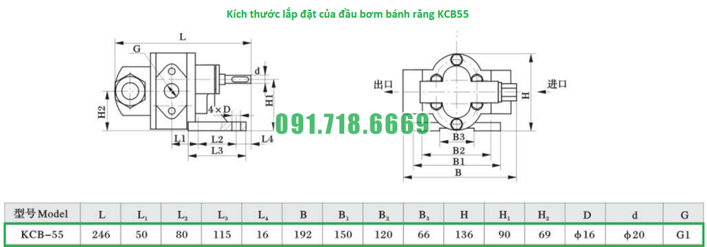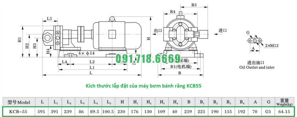 Bảng thông số kỹ thuật của bơm bánh răng KCB55 hiệu suất 33.3 lít/phút