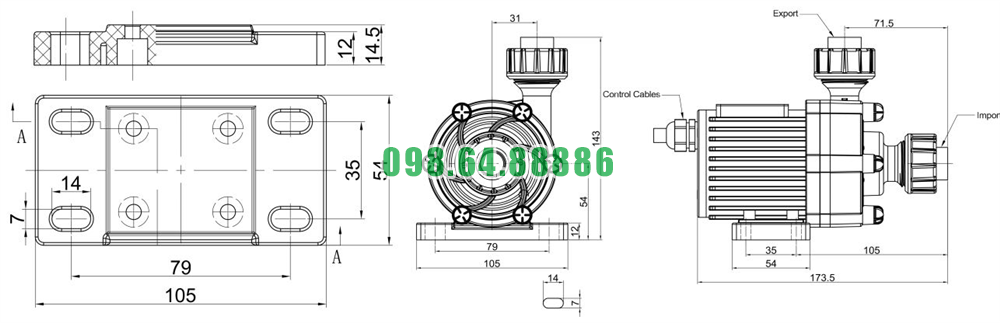 Cấu tạo và kích thước bản vẽ bơm hóa chất TDM-550PERU-DC48-DC lưu lượng 83 L/m công suất 258w