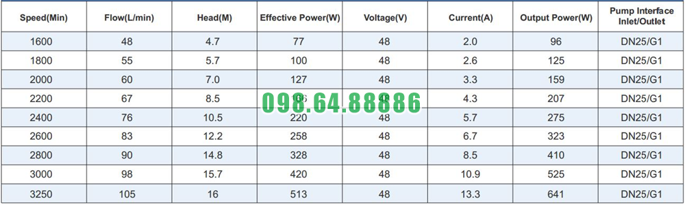 Bảng thông số kỹ thuật bơm hóa chất TDM-550PERU-DC48-DC lưu lượng 83 L/m công suất 258w