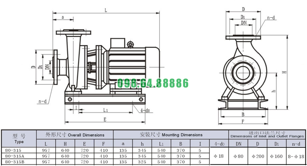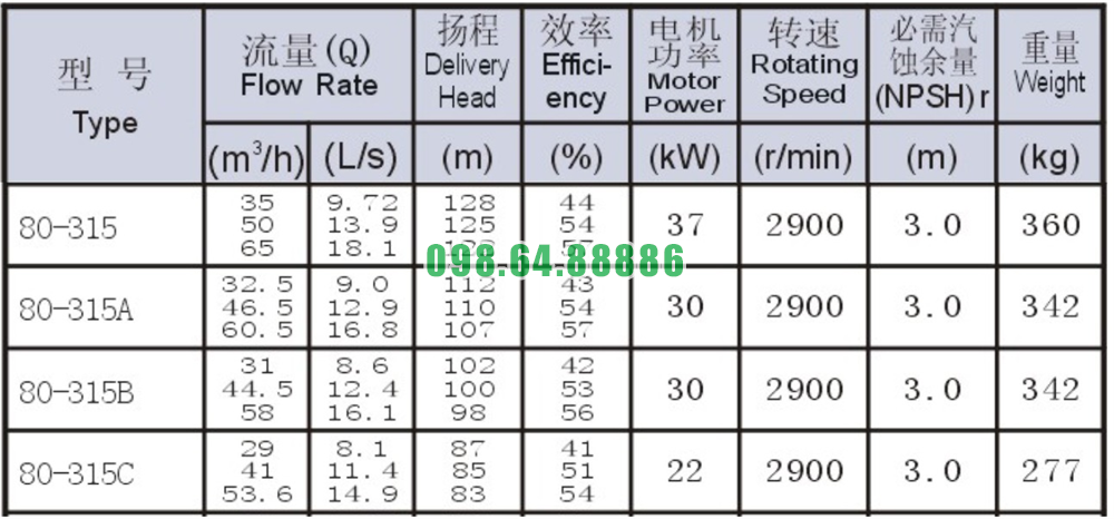 Bảng thông số kỹ thuật bơm nước li tâm trục ngang công suất 65 m3/hs model SLW80-ISW80-315