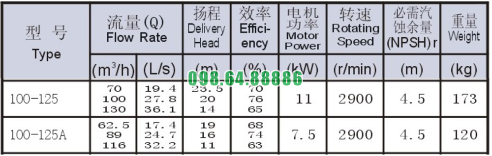 Bảng thông số kỹ thuật bơm nước li tâm trục ngang động cơ 11 kw SLW100-ISW100-125