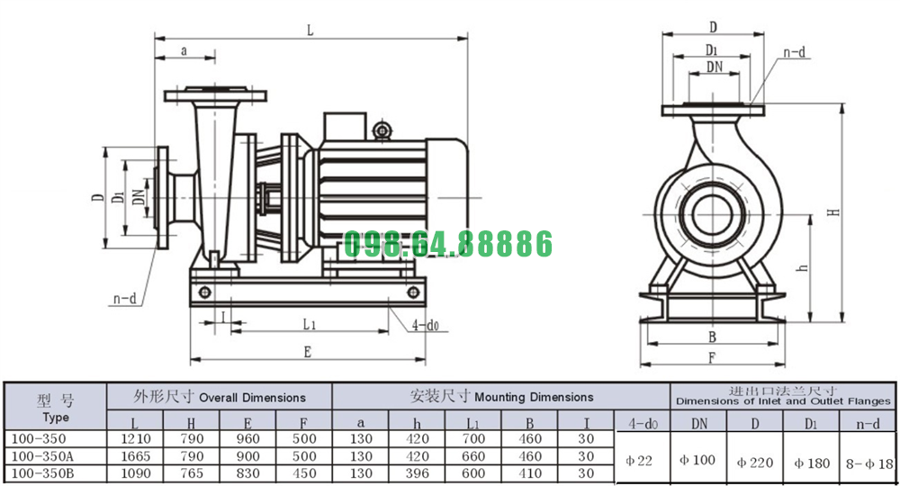 Bản vẽ cấu tạo và kích thước bơm nước li tâm trục ngang lưu lượng 33.3 L/s mã SLW100-ISW100-350