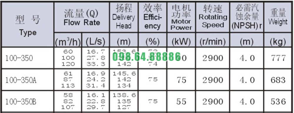 Bảng thông số kỹ thuật bơm nước li tâm trục ngang lưu lượng 33.3 L/s mã SLW100-ISW100-350