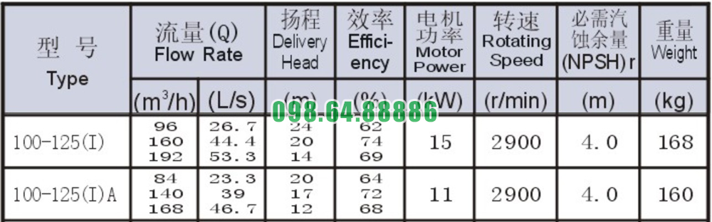 Bảng thông số kỹ thuật bơm nước nằm ngang SLW100-ISW100-125-I đẩy cao từ 14m- 24m