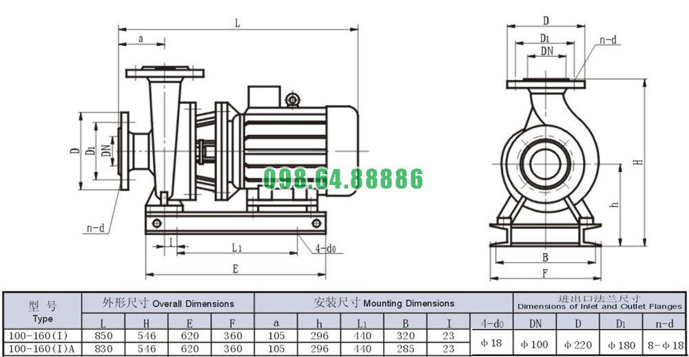 Bản vẽ cấu tạo và kích thước bơm nước trục ngang model SLW100- ISW100-160-I công suất 22 kw đẩy cao 36m