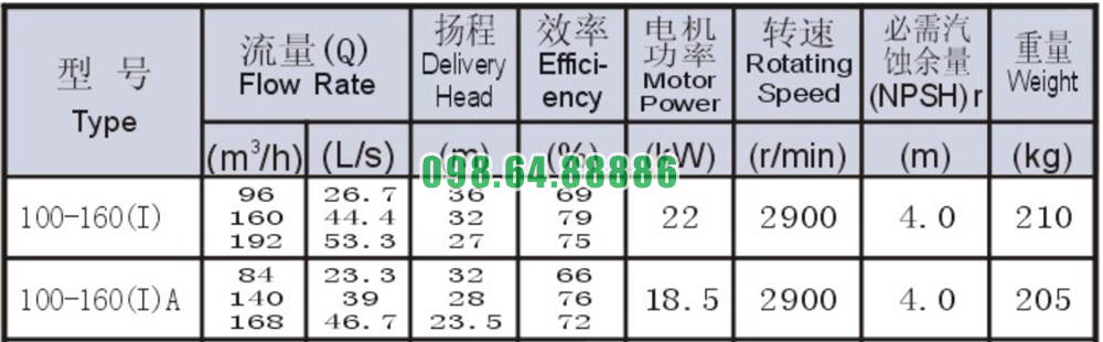 Bảng thông số kỹ thuật bơm nước trục ngang model SLW100- ISW100-160-I công suất 22 kw đẩy cao 36m