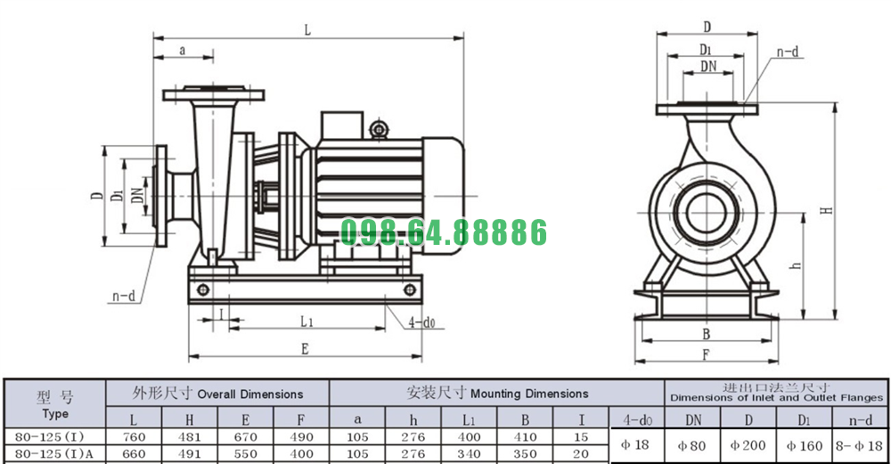 Bản vẽ cấu tạo và kích thước bơm nước trục ngang SLW80-ISW80-125-I lưu lượng 36.1 L/s