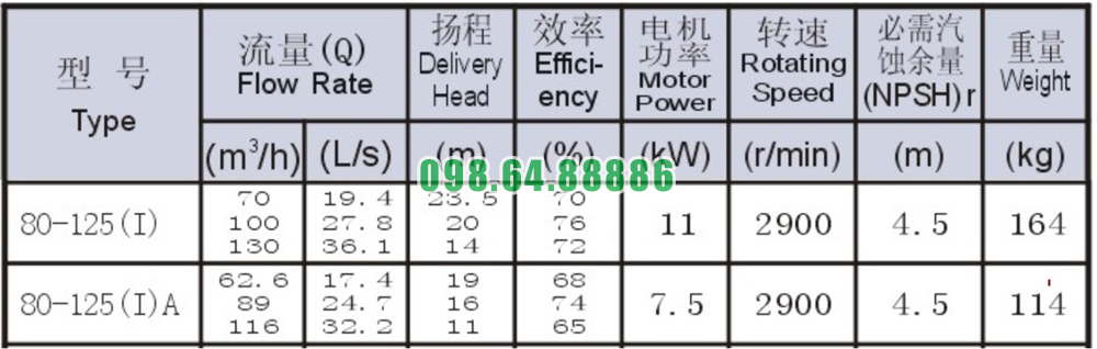 Bảng thông số kỹ thuật bơm nước trục ngang SLW80-ISW80-125-I lưu lượng 36.1 L/s