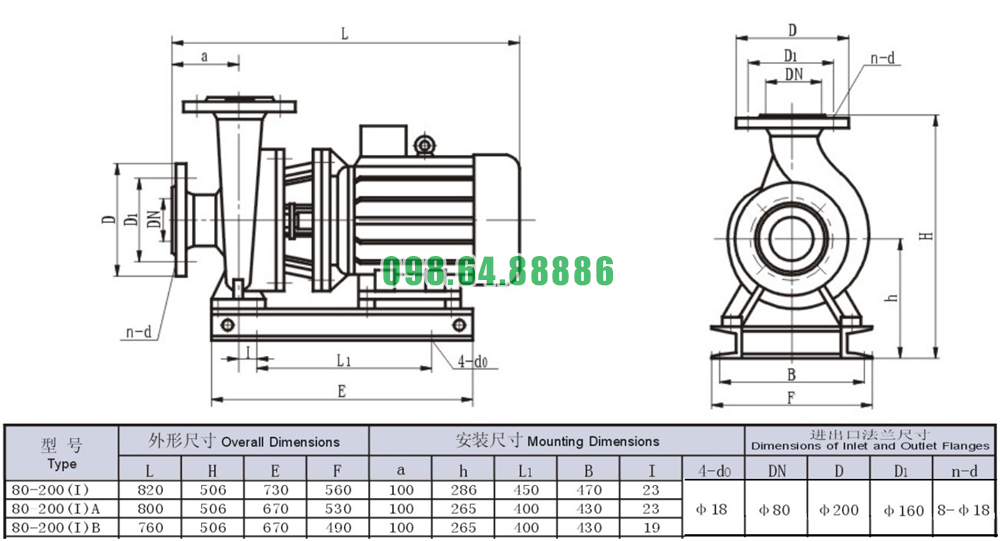 Bản vẽ cấu tạo và kích thước bơm nước trục ngang SLW80-ISW80-200-I lưu lượng 36.1 L/s