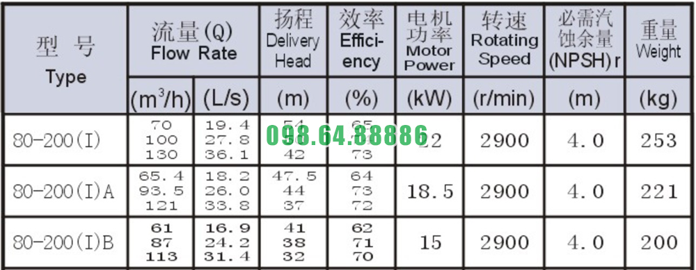 Bảng thông số kỹ thuật bơm nước trục ngang SLW80-ISW80-200-I lưu lượng 36.1 L/s