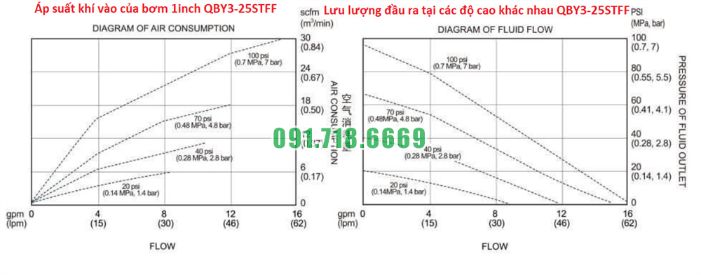 Đường cong hiệu suất của máy bơm màng áp suất 8 kg/cm2 mã QBY3-25STFF