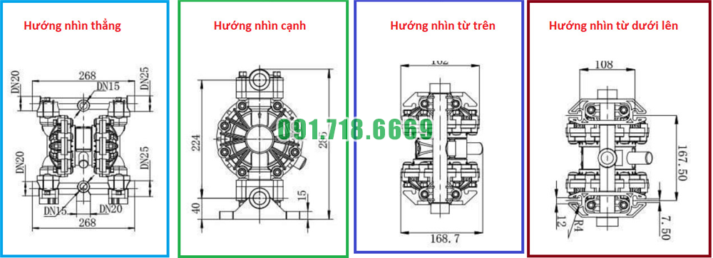 Bản vẽ kích thước của máy bơm màng áp suất 8 kg/cm2 mã QBY3-25STFF